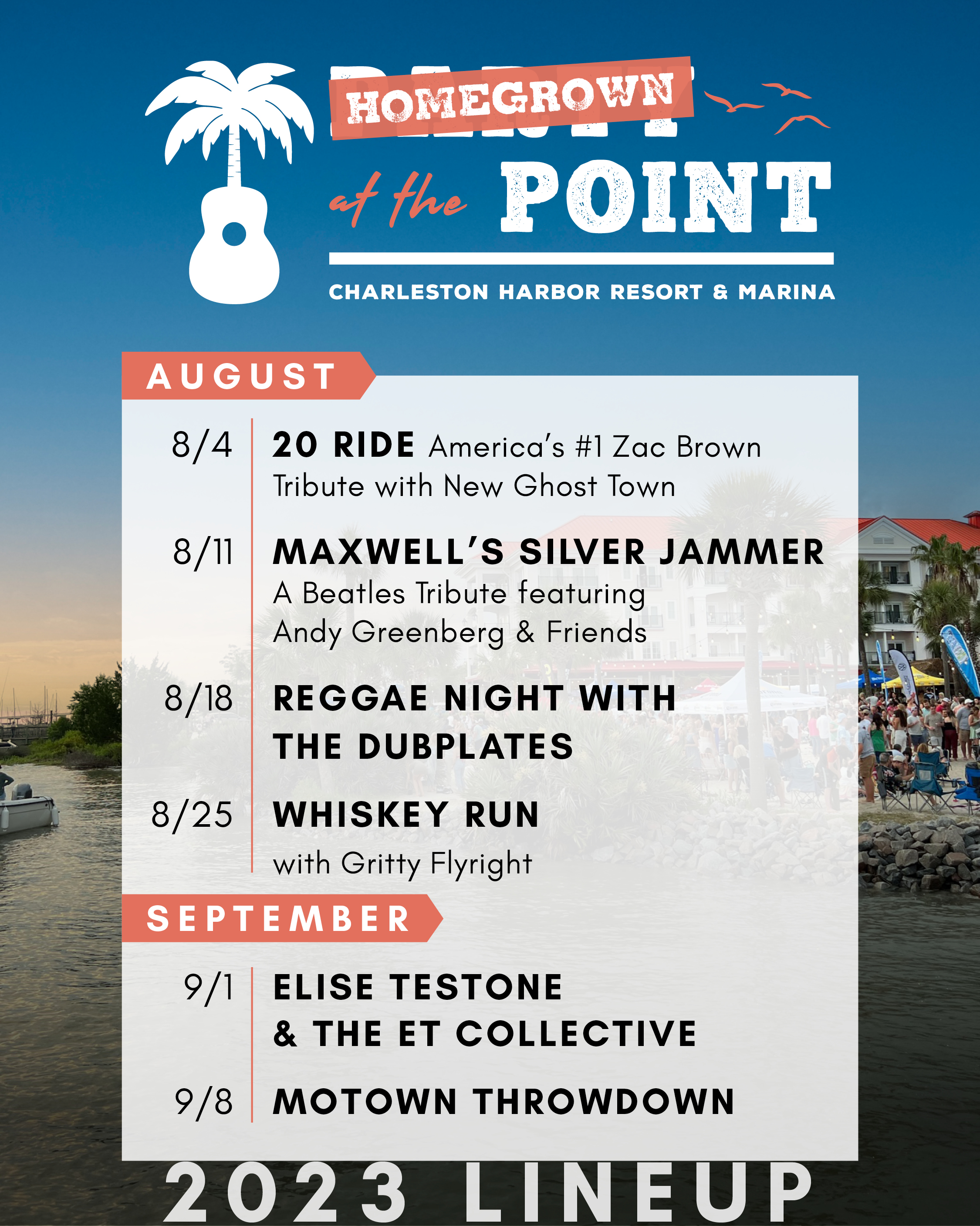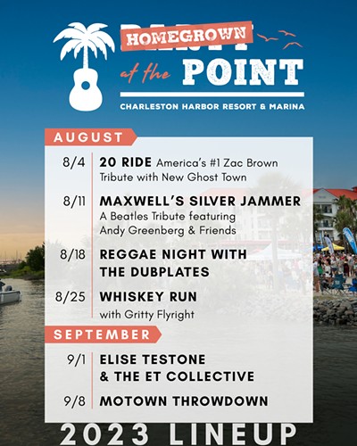 Charleston’s premiere Happy Hour concert series continues this August and September, featuring all local bands! Homegrown At The Point is an extension of Charleston's best and longest running happy hour concert series in town and its only beach party.