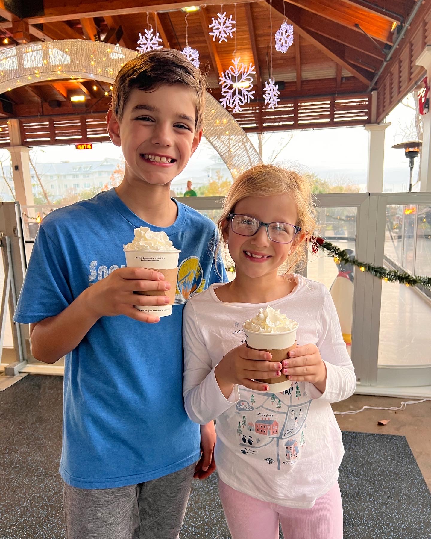 Chill out with our tasty cold beverages, enjoy s'mores by the firepits, sip on hot cocoa, rent firepit experiences by the rink or Gondolas overlooking the harbor and let your kids enjoy jump castles, games and more.