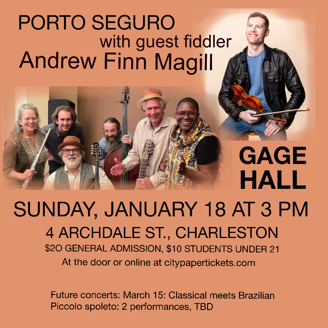 Porto Seguro, featuring special guest fiddler Andrew Finn Magill, will explore the roots of Brazilian jazz, including choro, samba, and bossa nova. This concert is the second in Porto's 2025/2026 series and will take place on Sunday, January 18, at 3:00 PM in Gage Hall.