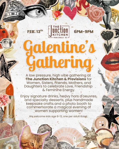 Women, Sisters, Friends, Mothers & Daughters are invited to a low pressure, high vibe gathering at The Junction Kitchen & Provisions to celebrate Love, Friendship, and Feminine Energy. Enjoy signature drinks, heavy hors d'oeuvres, and specialty desserts, plus handmade keepsake crafts and a photo booth to commemorate a magical evening of women supporting women!