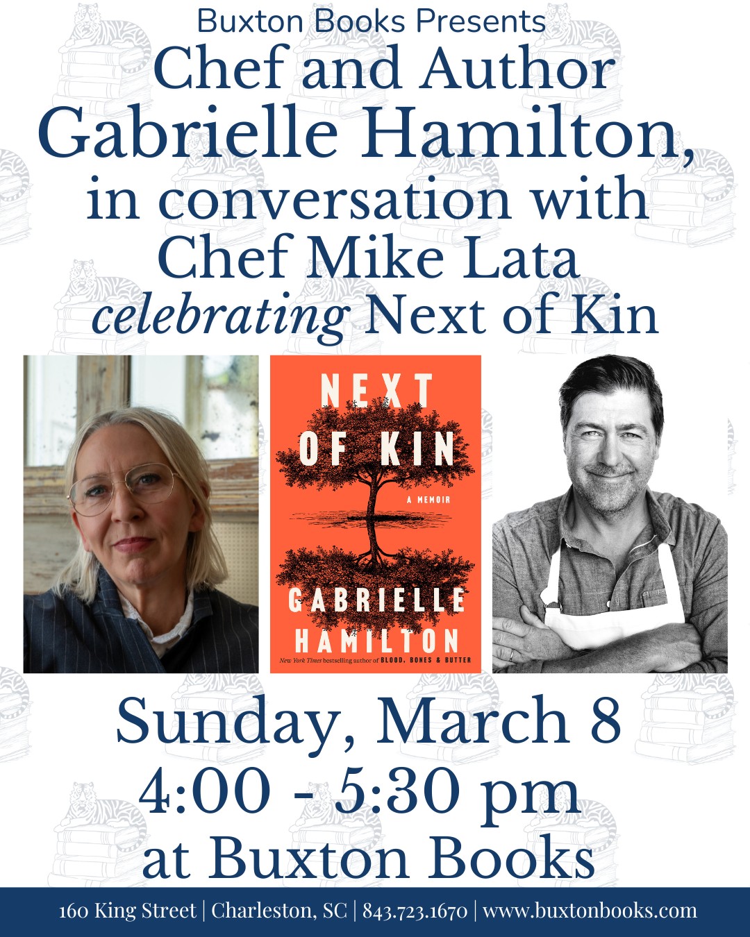 Buxton Books is excited to welcome Gabrielle Hamilton, author of Blood, Bones, and Butter, and chef and owner of the iconic restuarant Prune, to the bookstore to celebrate her new memoir, Next of Kin. Hamilton will be joined in conversation by Charleston's Mike Lata, executive chef and co-owner of FIG.