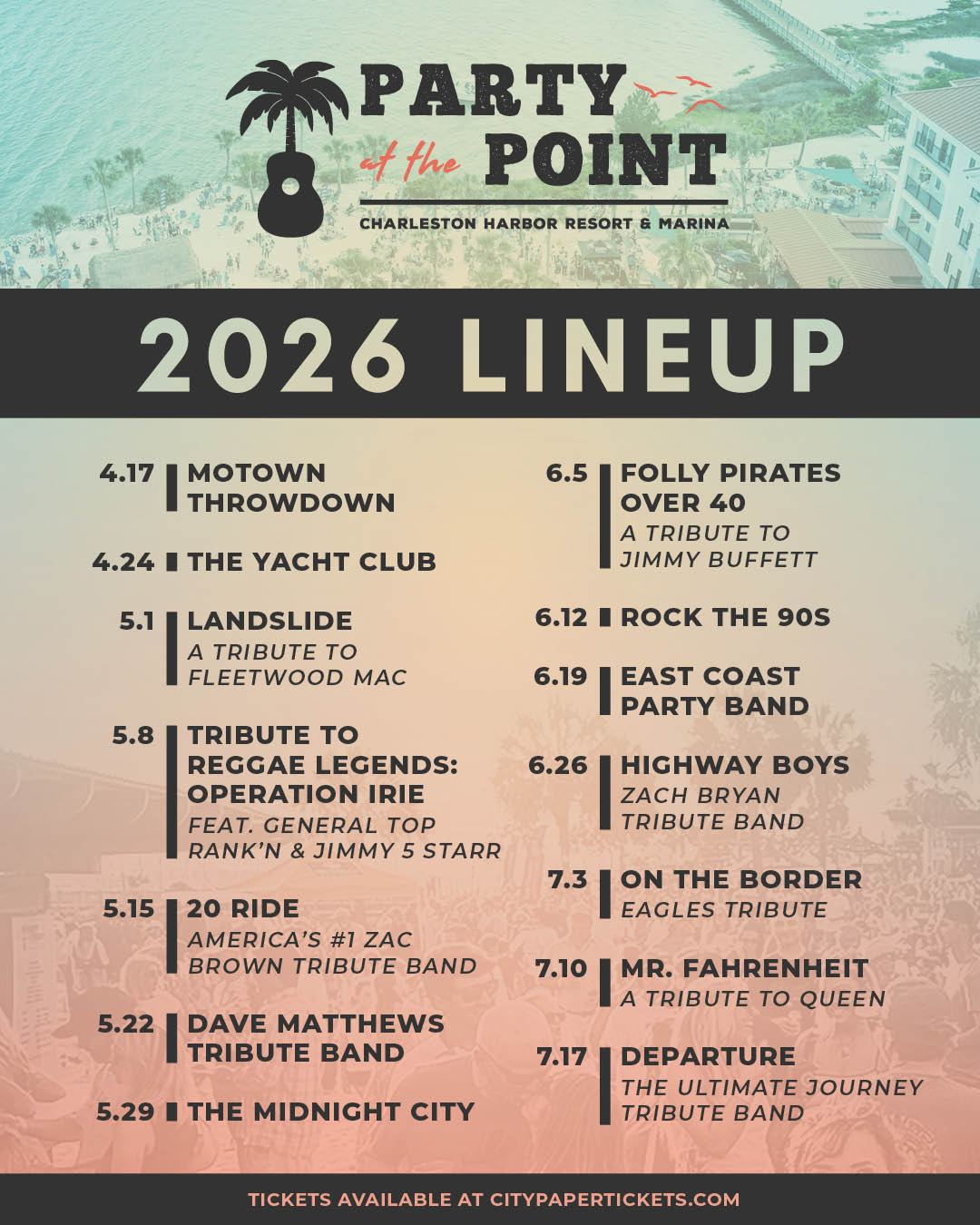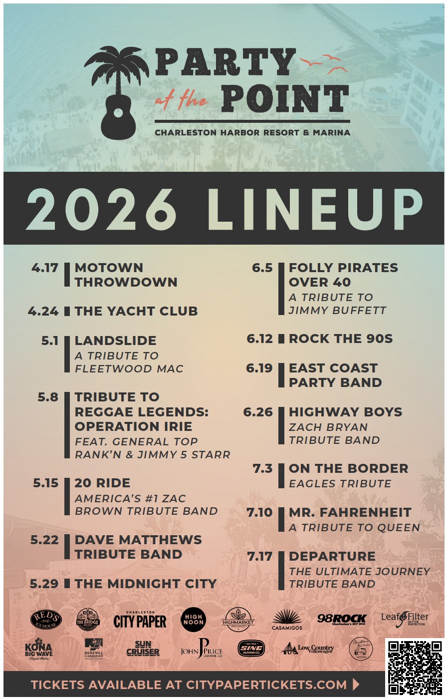 Charleston’s premiere Happy Hour concert series is back for its 26th season that takes place Friday evenings from April 17 - July 17! Party At The Point is Charleston's best and longest running happy hour concert series in town. We are ready to open the doors to Charleston's one & only Beach Party!