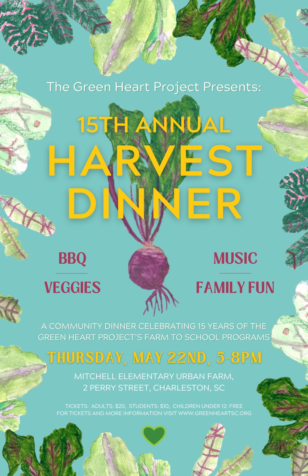 The Harvest Dinner is Green Heart Project's annual springtime event, celebrating another year of growing food, minds & community in Charleston schools. Hosted in tandem with Charleston Housing Authority, the event will showcase Green Heart's 1/2-acre, community-based Urban Farm at Enston Home, hosting 500-1,000 attendees for a garden-fresh dinner, entertainment, & family-friendly activities.
