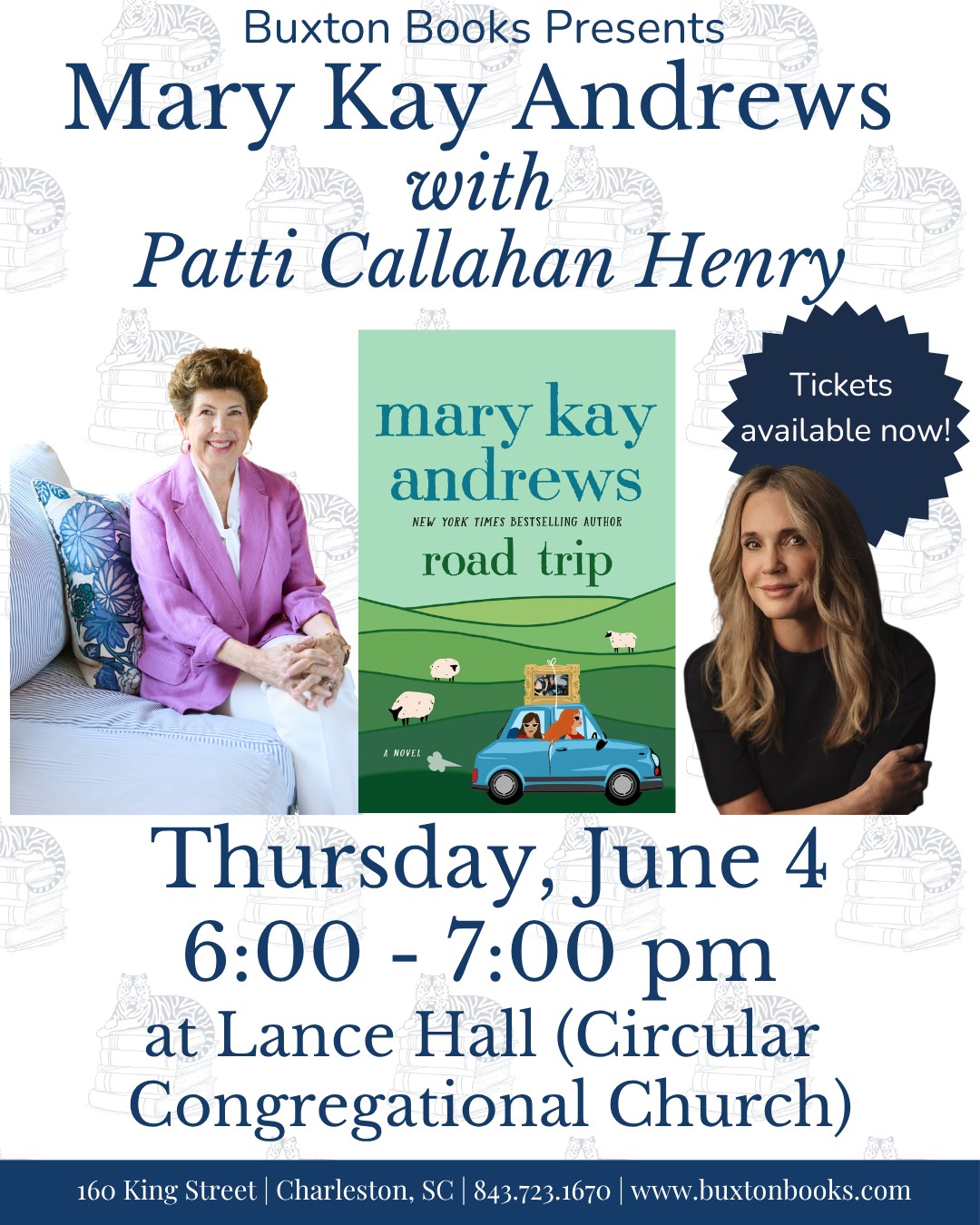 Buxton Books is excited to welcome Mary Kay Andrews to Charleston to celebrate her new book, Road Trip. Mary Kay will be in conversation with friend and fellow author, Patti Callahan Henry. Get your ticket now to join us!
